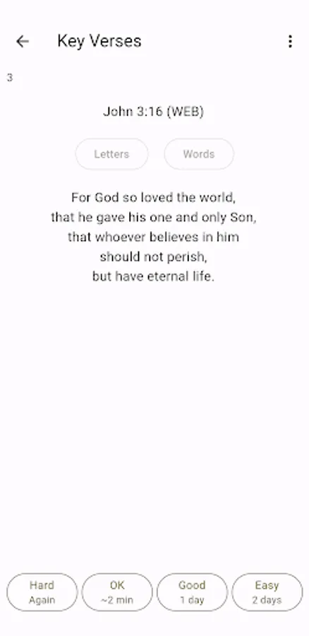 This app provides an easy and effective way to learn Bible verses by heart. It assumes that you'll spend at least a few minutes every day learning new verses or reviewing old ones.