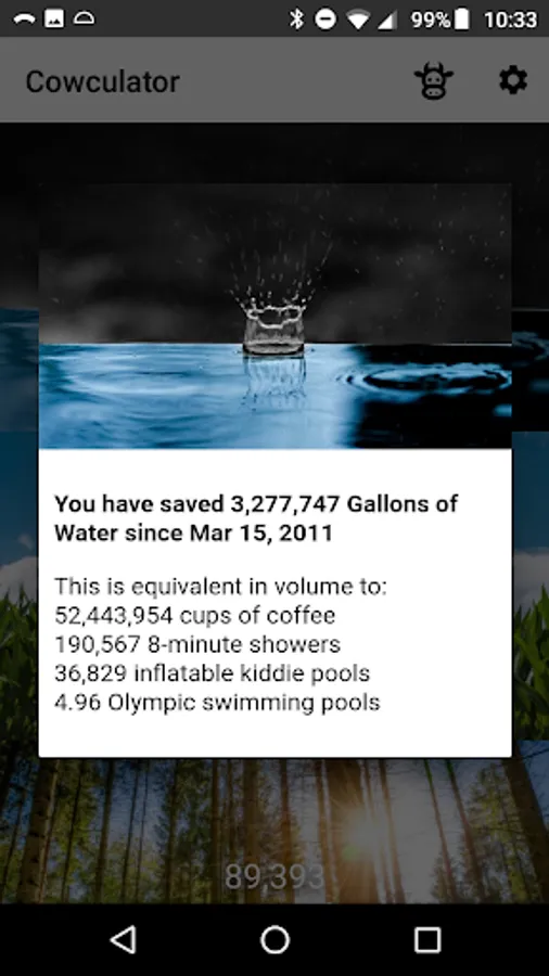 By simply entering your veganniversary (the day you became vegan) Cowculator calculates how much water, grain, forested land, CO2 equivalent, and animal lives you have saved by going vegan.