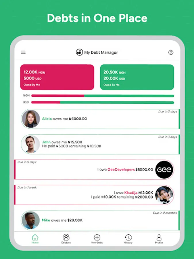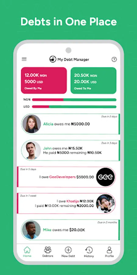 With My Debt Manager, you can easily track and manage your debts in one convenient place. Your information is automatically backed up, so you won't lose your debt records even if you switch phones. The app utilizes two colors, Red and Green, making it simple to distinguish debts owed to you (Green) from debts owed by you (Red).