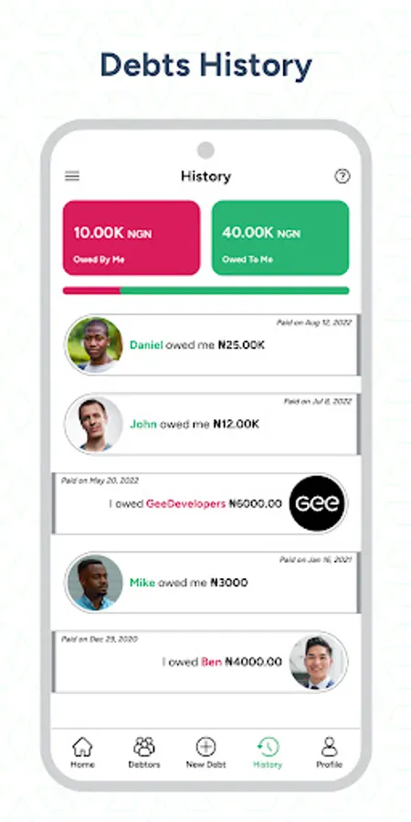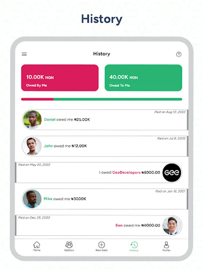 Debt and Debtor History: Save and access detailed records of debtors and their respective debts.