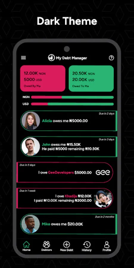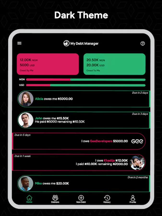 Reminder Notifications: Receive timely reminders for upcoming and overdue debts via notifications.