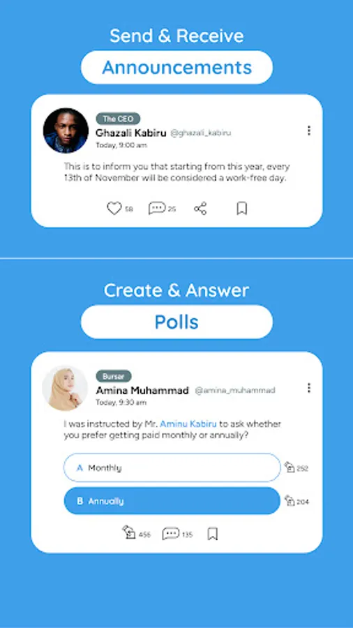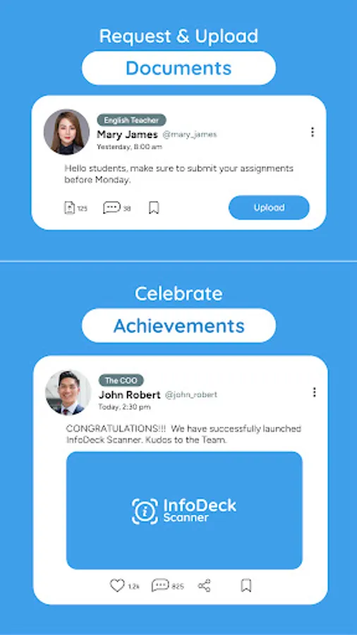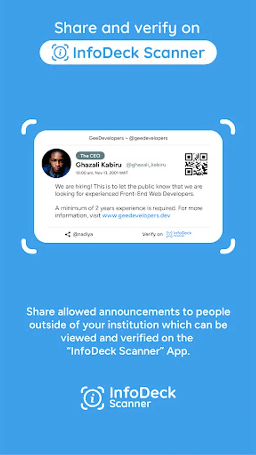 InfoDeck is an app that allow users to send and receive announcements and perform various other tasks, such as creating polls and requesting documents, within their institution. It can also be used to learn more about the members of the institution, send complains/reports, send suggestions, celebrate achievements, and more.