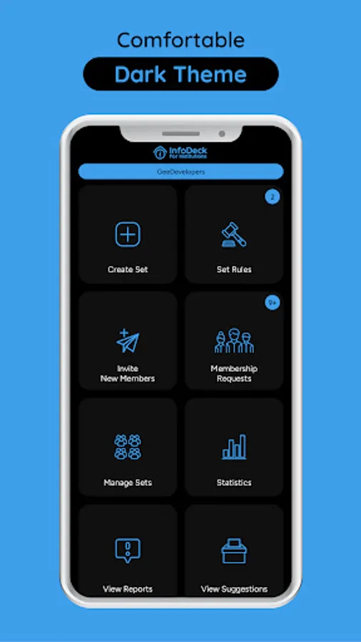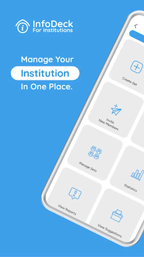 InfoDeck For Institutions is an app used to create, control, and manage your institution on InfoDeck. You can create an institution, choose a unique joining code, group your members into sets, create forms, set rules on sending announcements, send invitations, accept, reject, block, unblock, remove or blacklist members, select admins, view statistics, and more.