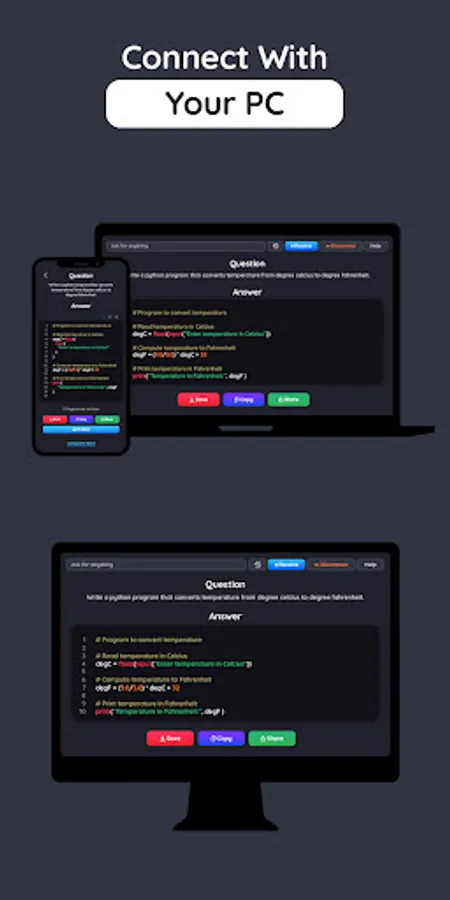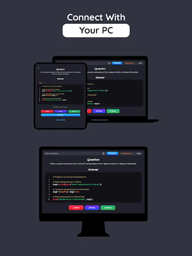 The app is available in both desktop and mobile versions, with the desktop version available for download at geedevelopers.dev. The mobile app allows users to share code, answers, or solutions from the mobile app to the desktop app, making it easier to work on projects across multiple devices.