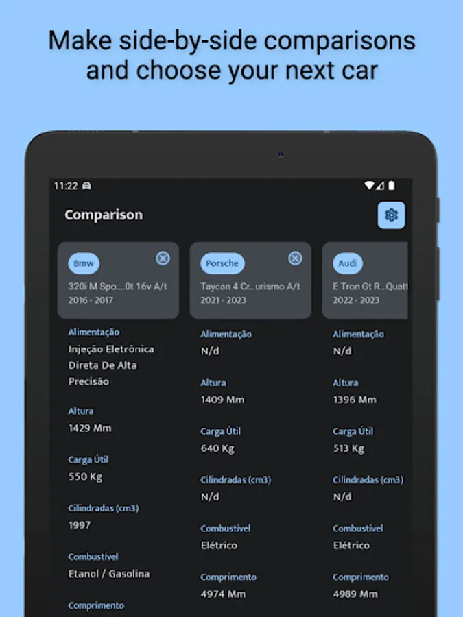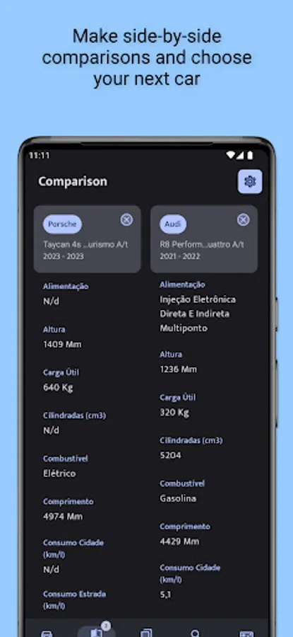 **Comparação de Carros:** Compare diferentes modelos lado a lado para tomar decisões informadas. Analise as diferenças e semelhanças entre veículos, desde o desempenho até os recursos de conforto. Encontre o carro perfeito que atenda às suas necessidades e preferências.