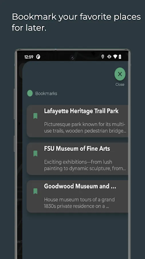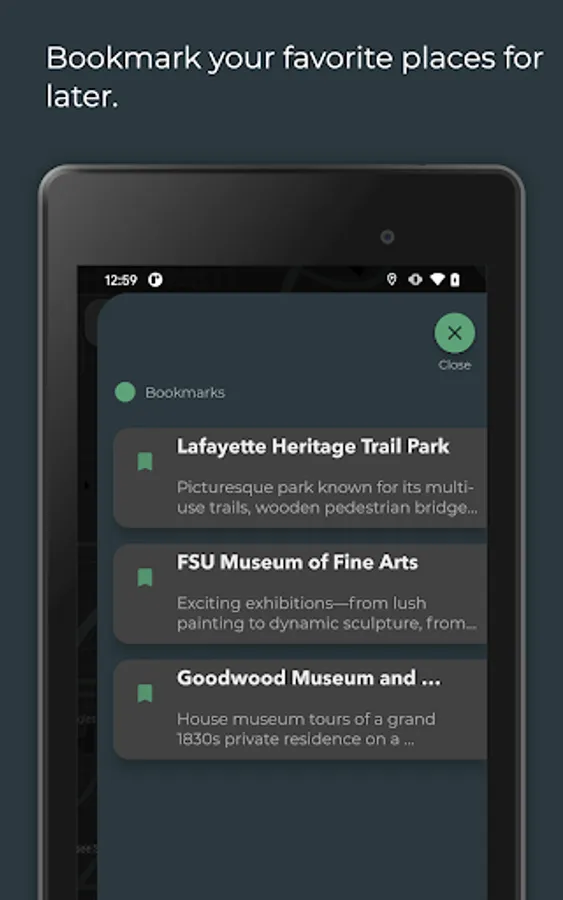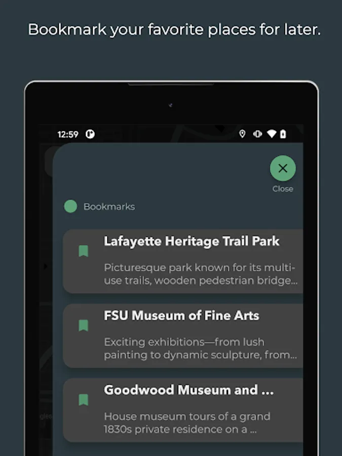 - Bookmark places to explore later