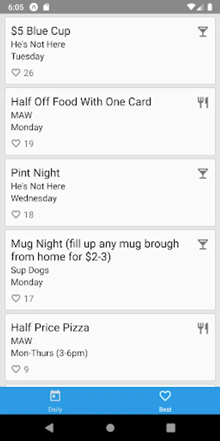 This app allows you to sort through the deals by day of the week, by type of deal including food, drink or event, and by other peoples favorite deals.