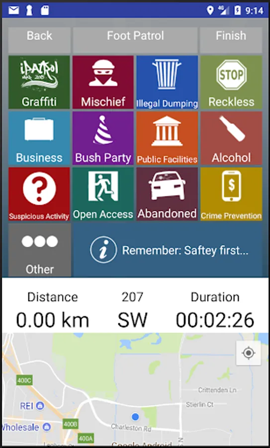 Users can document community interactions, patrol routes, and various activities. The location of many different types of incidences will be recorded and summarized into a report (consisting of both a PDF and an Excel document). The report can then be emailed to a designated department or specific individuals to advise them of the documented issues.