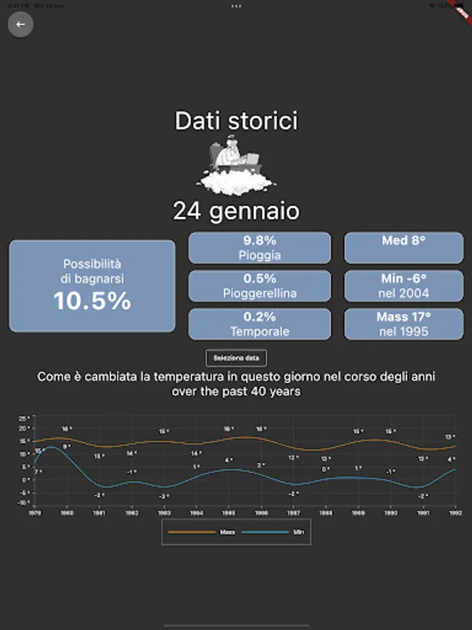 Temperature records. What was the minimum/maximum temperature that day and in what year? Likely to get wet today based on statistics.
