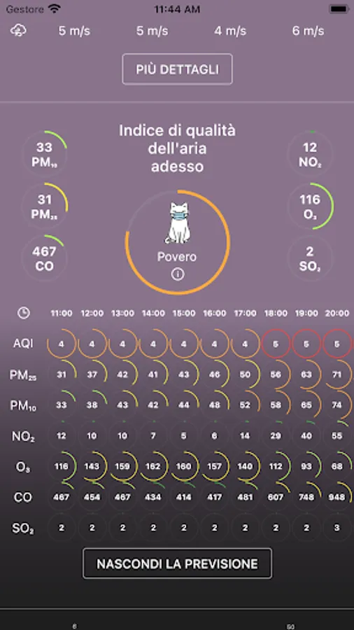 Air quality index based on concentration of CO (carbon monoxide), NO (nitrogen oxide), NO2 (nitrogen dioxide), O3 (ozone), SO2 (sulfur dioxide), PM2.5 (small particles), PM10 (large particulate matter), NH3 (ammonia).