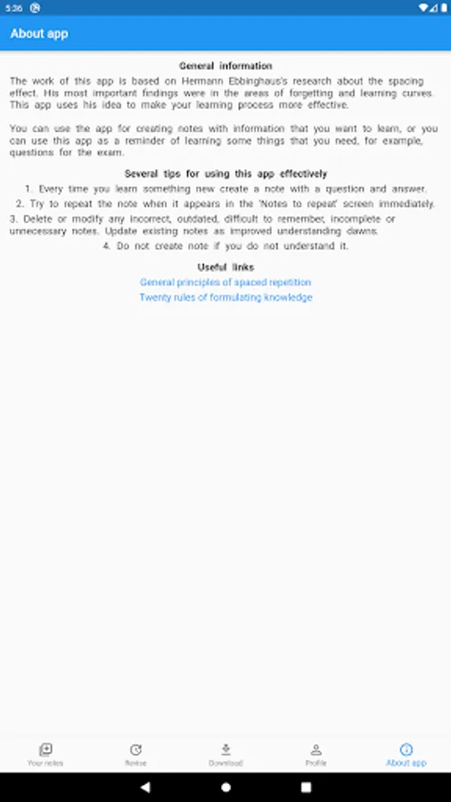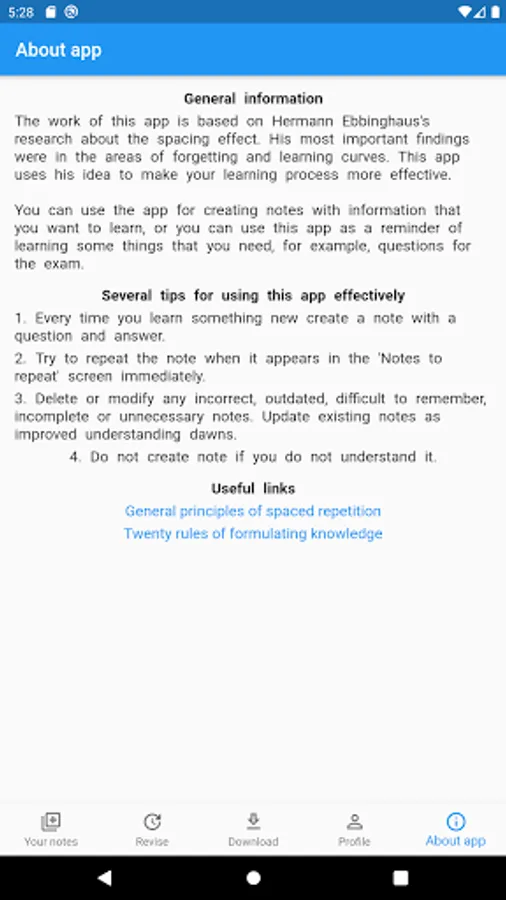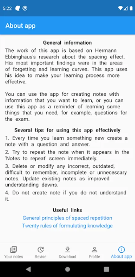 The work of this app is based on Hermann Ebbinghaus's research about the spacing effect. His most important findings were in the areas of forgetting and learning curves. This app uses his idea to make your learning process more effective.