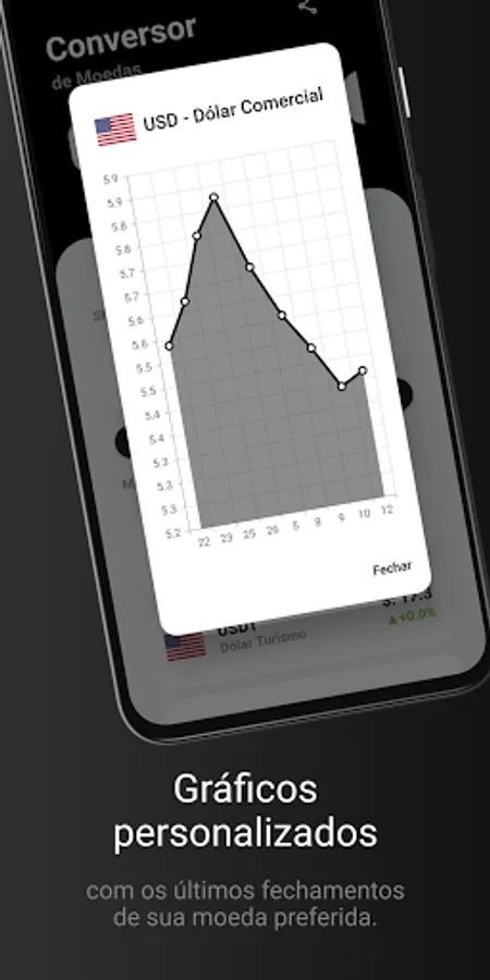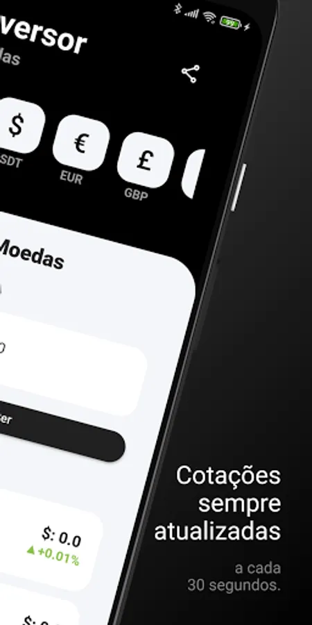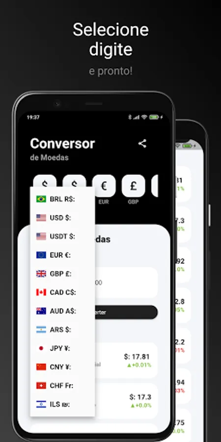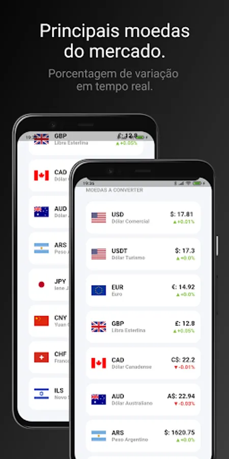 - Display of various currencies (Real, Dollar, Euro, British Pound, Canadian Dollar, Australian Dollar, Argentine Peso, Japanese Yen, Chinese Yuan, Swiss Franc and Israeli New Shekel)