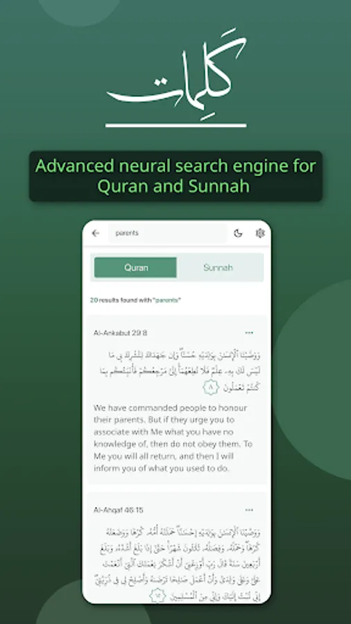 - مشاركة الآيات والأحاديث والاحتفاظ بها في قائمة المفضلة للعودة إليها لاحقًا.