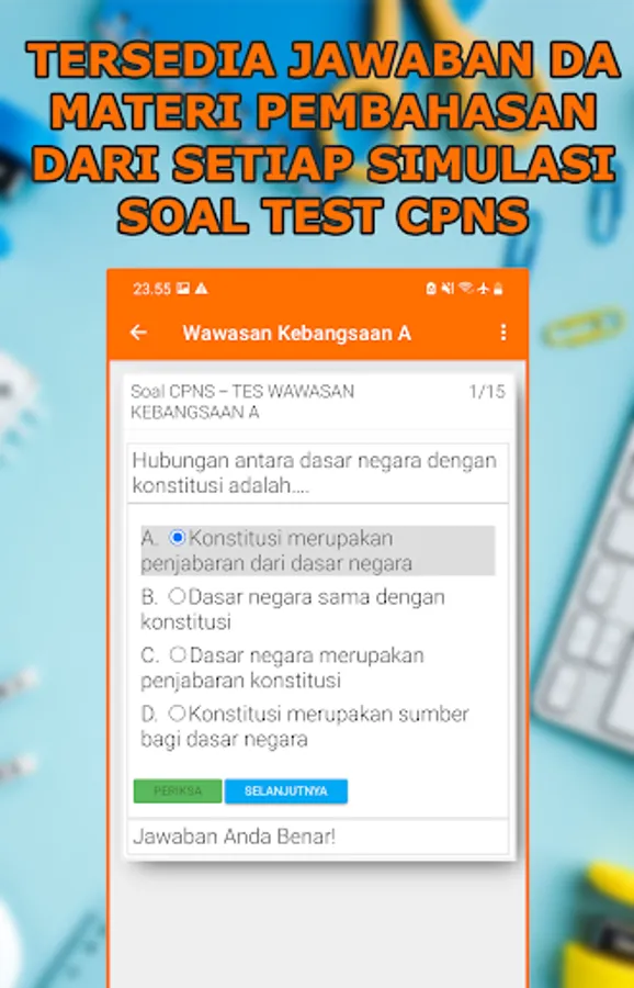 🥇 Quite Realistic Exam Simulation: Face the real exam experience through the CAT CPNS 2023 simulation. Feel the real test atmosphere to reduce anxiety and improve your performance when the important day arrives.