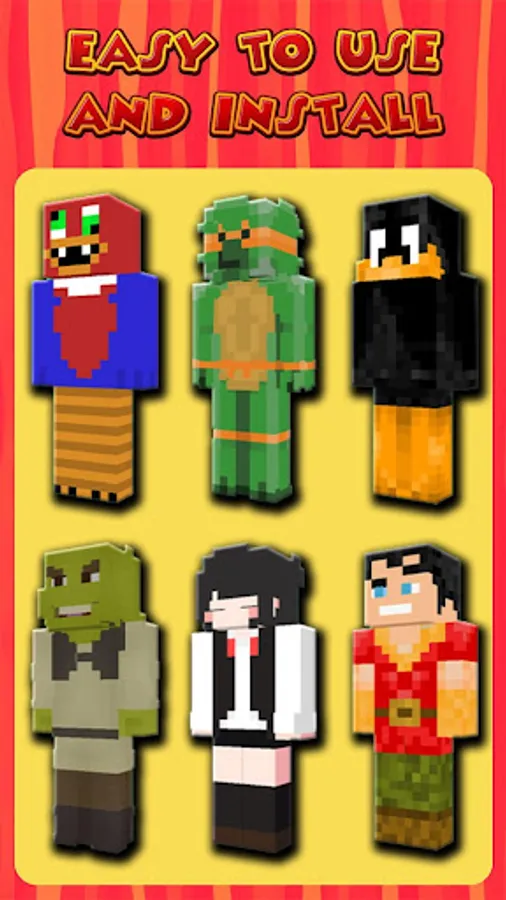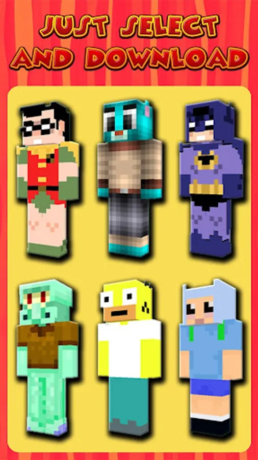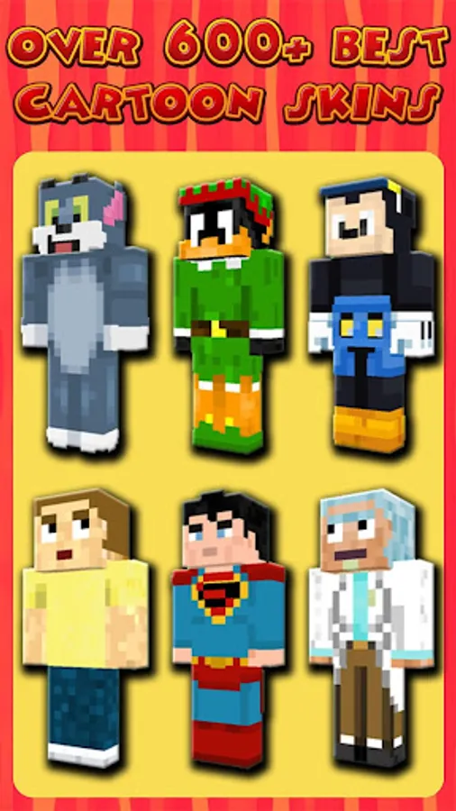 This application is for Minecraft fans, as well as for anyone who wants to diversify their gameplay. By downloading the Cartoon Skins for Minecraft PE, you will get a unique set of skins for your favorite game absolutely free. Especially for you, we have collected a huge collection of the best skins that will surprise not only you, but also your friends. Cartoon Skins are accessible to everyone and will suit everyone. Download skins, share with friends and have fun in multiplayer mode. Play with other players with the coolest skins for Minecraft PE!