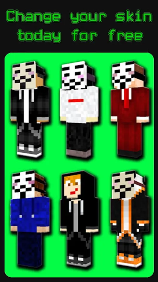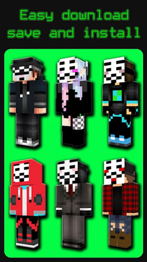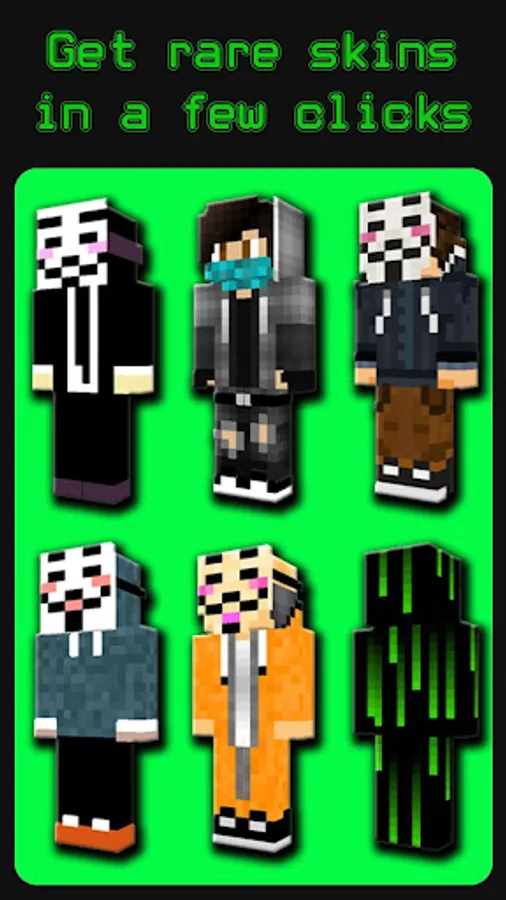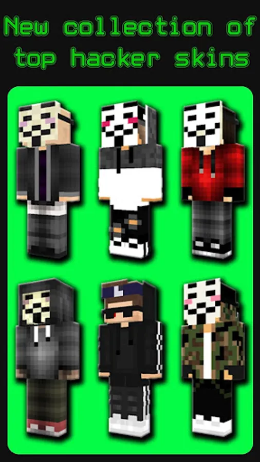 This application is for Minecraft fans and also for everyone who wants to diversify their gameplay. By downloading the Hacker Skins for Minecraft app, you will get a unique set of skins for your favorite game absolutely free. Here you will find only the best hacker skins for boys and girls. Everyone will choose a skin to their liking and taste. Watch, choose, download, install and enjoy. Play with other players with the coolest skins for Minecraft PE!