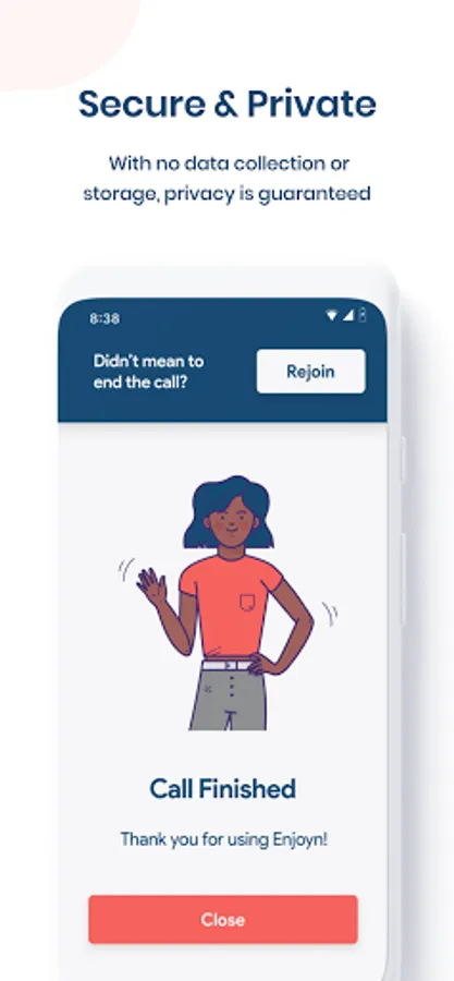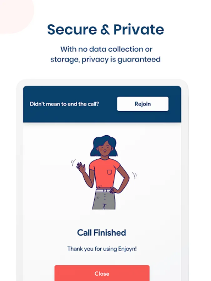 - Secure + Private: Take comfort in knowing calls stay between you and the organization. Enjoyn offers the best security available on the market and with no data collection or storage, privacy is guaranteed.