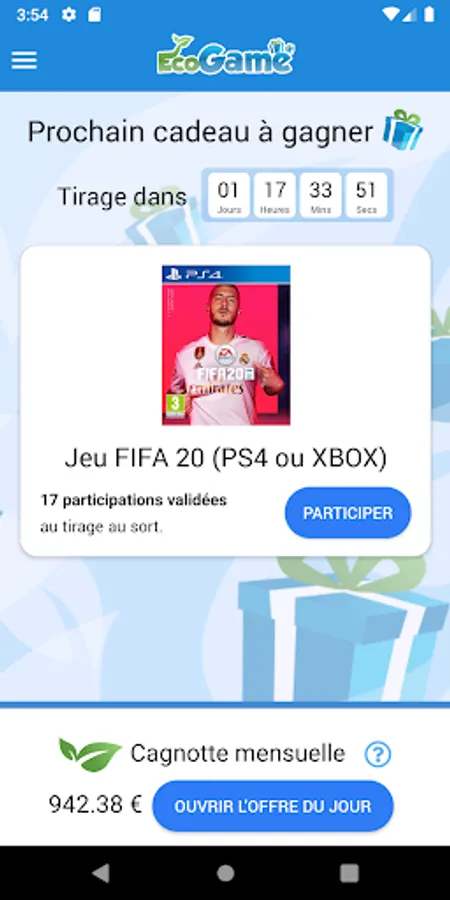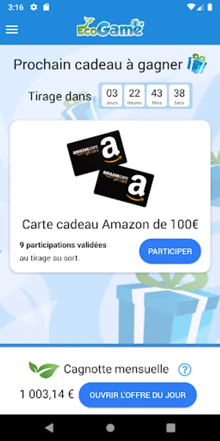 Win prizes effortlessly with this 100% free, ad-supported raffle game. With EcoGame you have everything to gain, and nothing to spend. In addition to this, you can participate in partner competitions and thus allow EcoGame to participate in 100% ecological actions. EcoGame is the only opportunity to win prizes while making donations and participating in actions without paying a single euro!