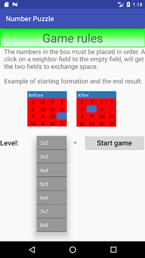 In this game, all the pieces must be placed in order by moving one piece at a time. A neighbor to the empty field (yellow) is moved by pressing the neighboring block. You can choose between 7 different playing slots from 2x2 to 8x8 fields. The amount of time and number of moves taken is shown below the game board.