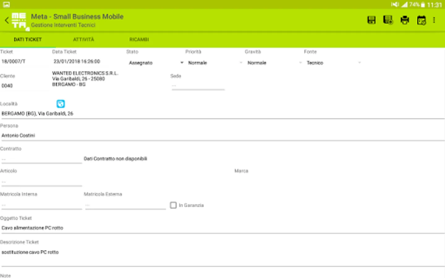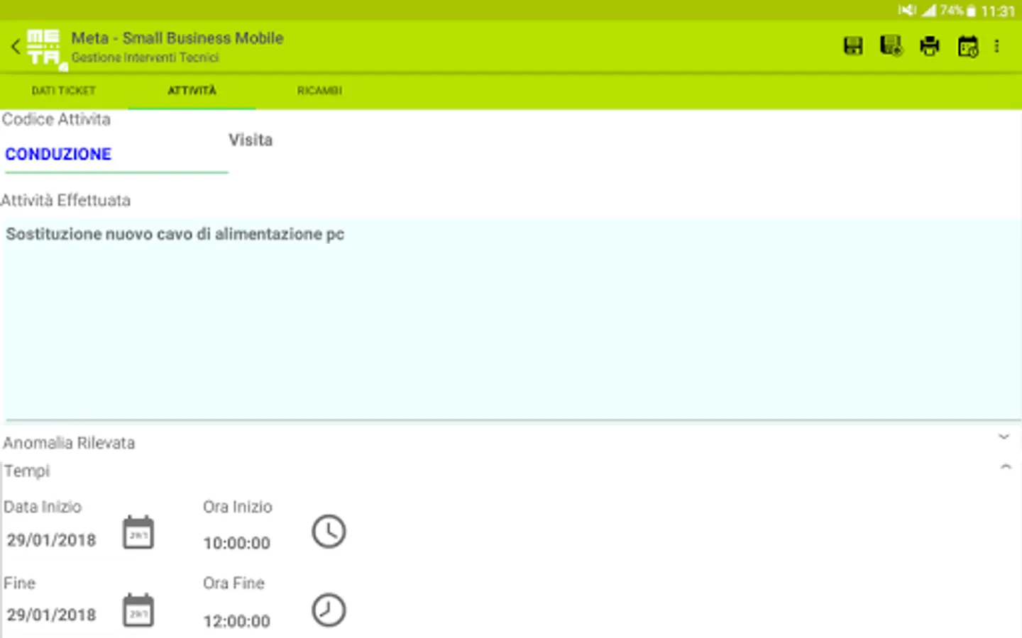 - Change the status of the ticket, enter the activities and times, report all the anomalies detected at the customer's premises