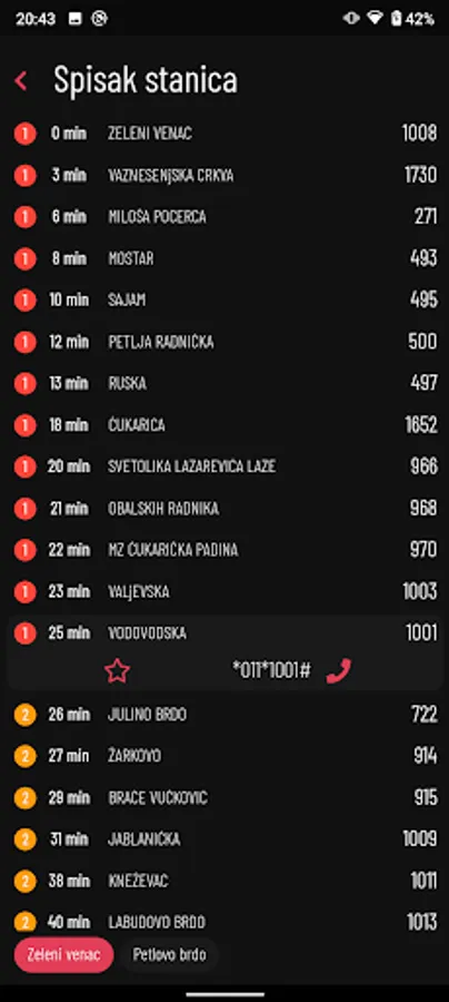 - favorite stations - in the details of the line it is possible to select favorite or most frequently used stations. For each selected station, the next three estimated arrival times of the vehicle at the given station are displayed. Arrival time is estimated based on the time of departure from the starting point and the time required to reach the given station