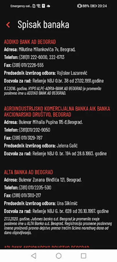 - list of banks - list of all banks, with basic information, in the Republic of Serbia
