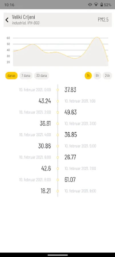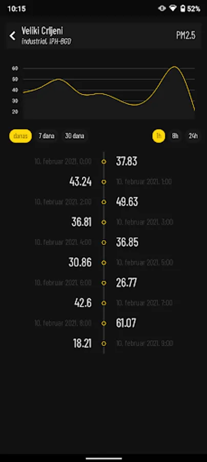 - depending on the location, graphs of measured data for SO2, PM10, O3, NO2, NOX, CO, B, Toluene, THC (NM), NO, mp-Xylene, PM2.5, PM1, V, dd, P are displayed , t, Rh