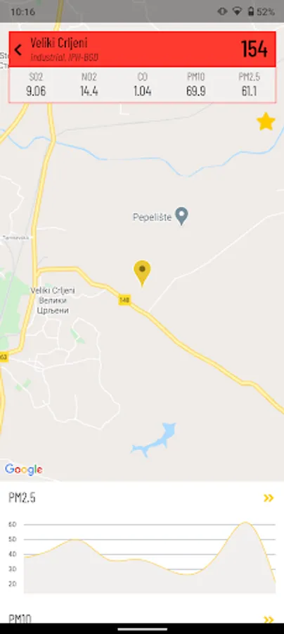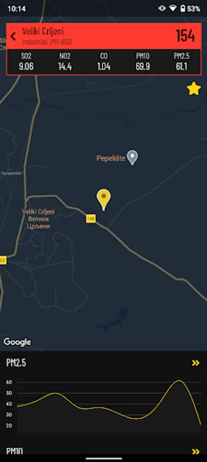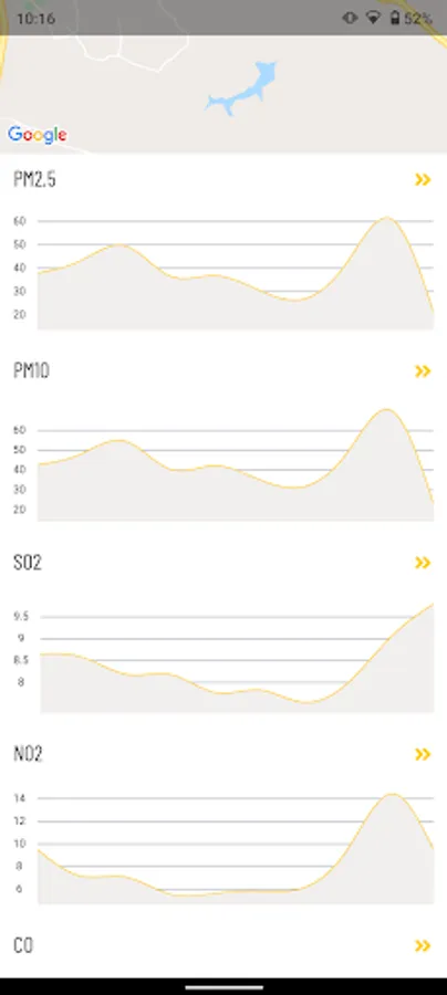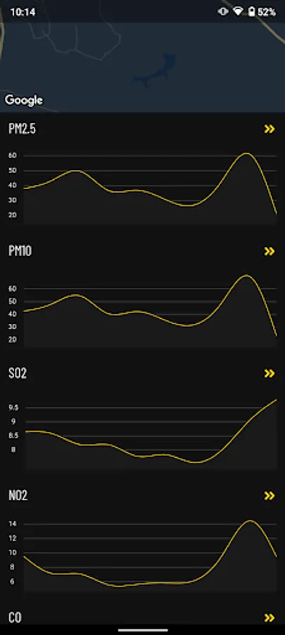 - selecting one or more favorite locations, in order to display the last measured values for SO2, NO2, O3, CO, PM10, PM2.5 in the list