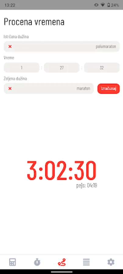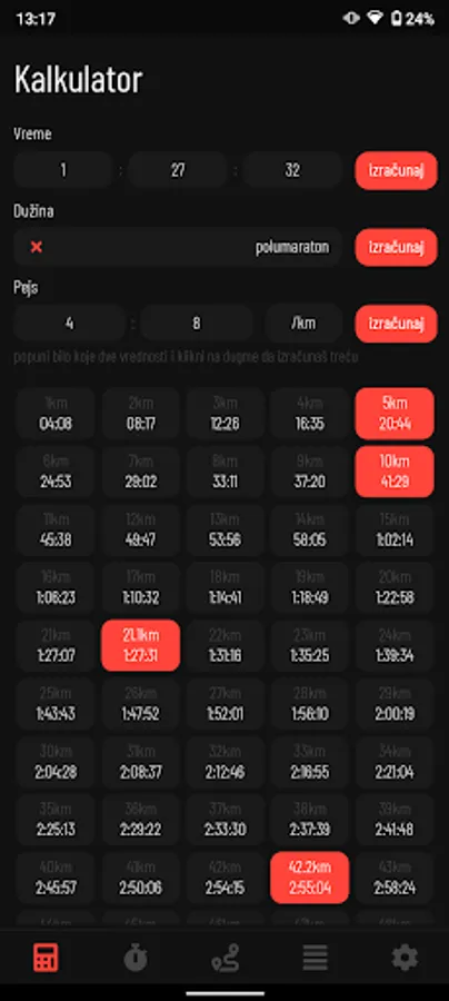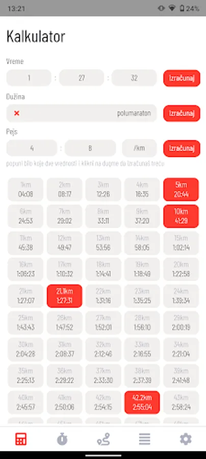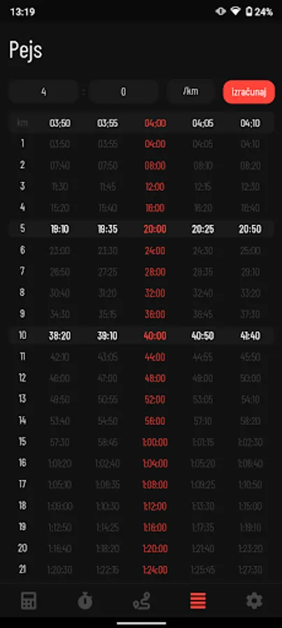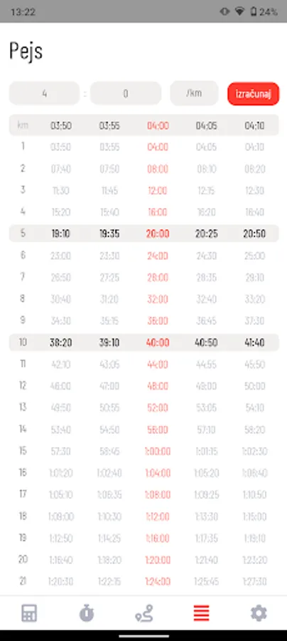 - Za uneti pejs (pace) mogu se videti prolazna vremena za svaki kilometar.