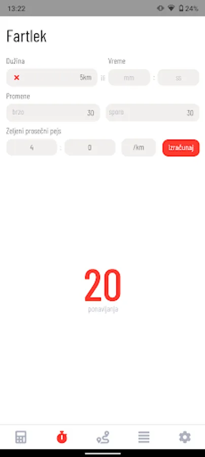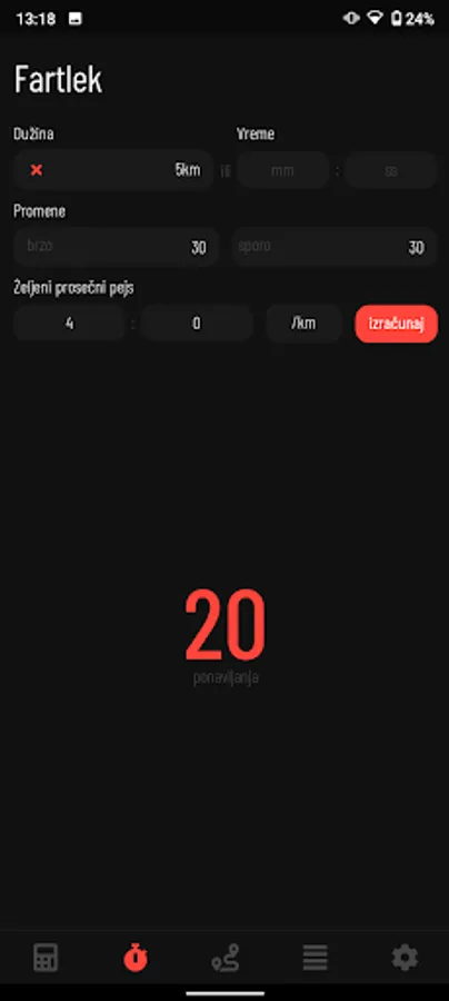 - Za fartlek/intervale je moguće izračunati broj ponavljanja.