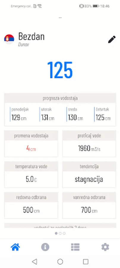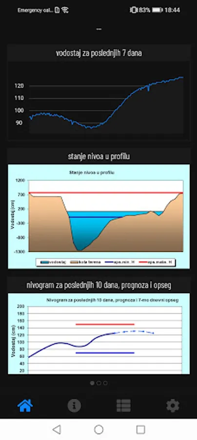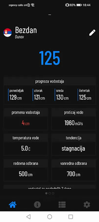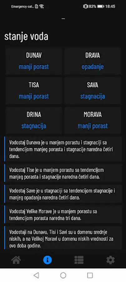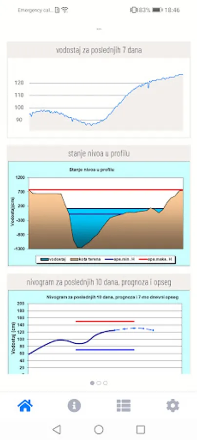 Forecast of river water levels for 2 to 4 days for 20 stations on the Danube, Tisza, Sava and Morava and hydrological situation and tendencies for small and medium watercourses in the Republic of Serbia. It is updated once a day.