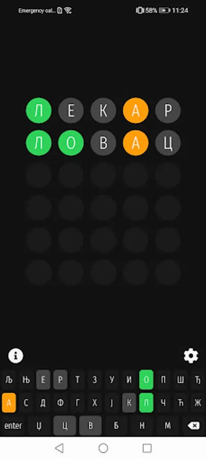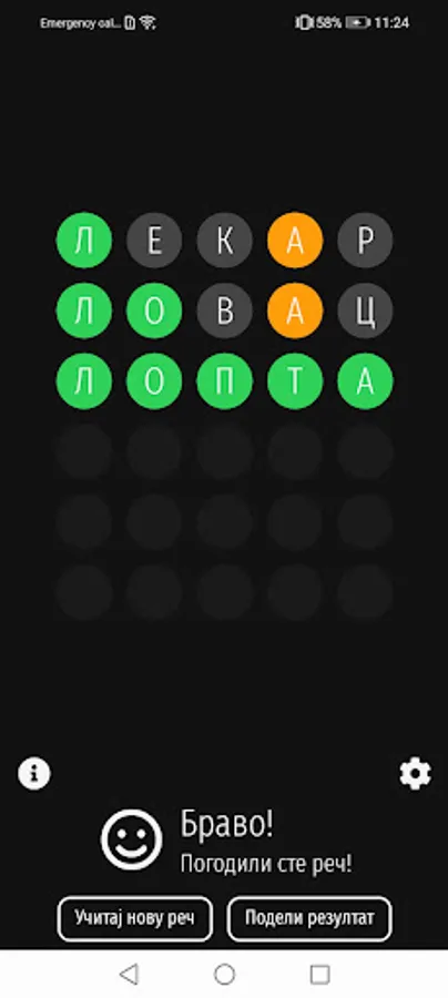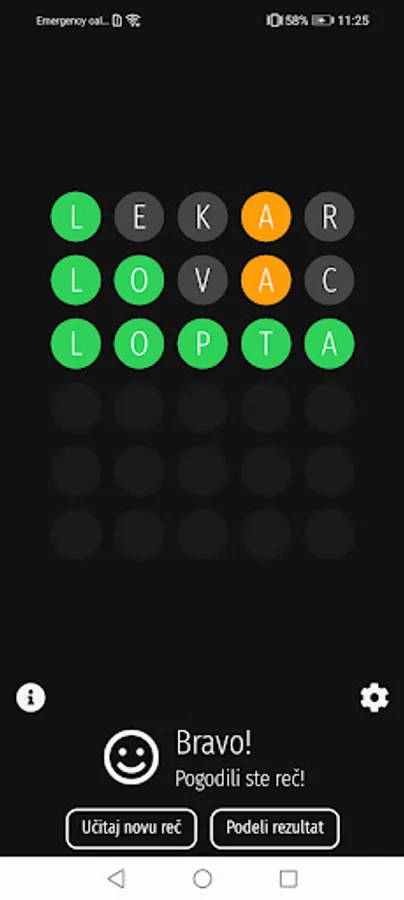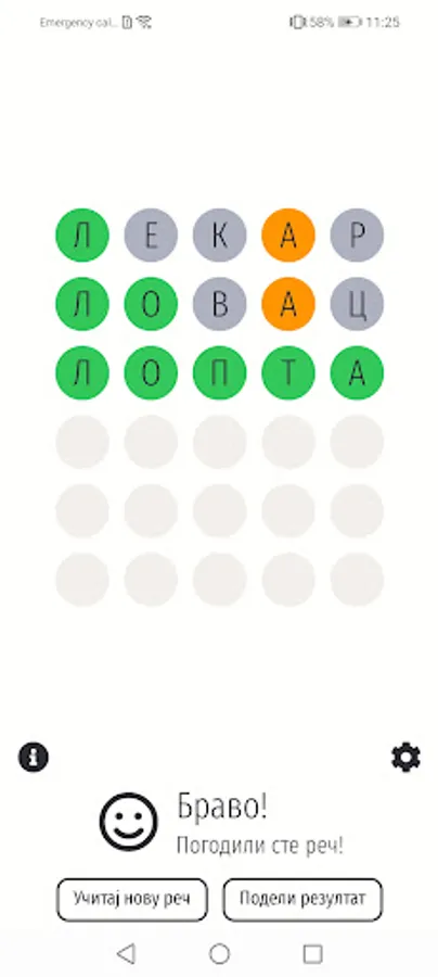 - Posle svakog pokušaja slova se označavaju zelenom, narandžastom, crvenom ili sivom bojom.