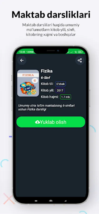 Ilovada 1-Sinfdan to 11-Sinfgacha bo`lgan O`zbek va Rus sinflari uchun barcha maktab darliklari, undan tashqari Uzbek adabiyoti, Jaxon adabiyoti va Ilmiy adabiyotlardan tashkil topgan bir qancha kitoblar mavjud