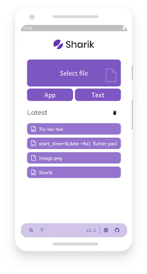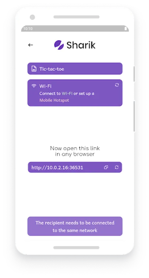 After selecting a language and going through the intro, you can see the sharing buttons and the history of files you shared on the main screen. You can share images, files, installed apps, or simply text. After selecting the file, you will be shown the Sharing screen. Here you can see your connectivity status (Wi-Fi/Mobile Hotspot) and the URL you need to open on the other device. After typing this URL in the browser and hitting Enter on the other machine, the file will start downloading. Please make sure that both devices are connected to the same network.