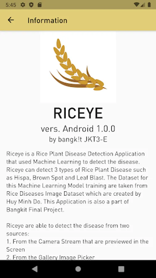 Riceye is a Rice Plant Disease Detection Application that used Machine Learning to detect the disease. Riceye can detect 3 types of Rice Plant Disease such as Hispa, Brown Spot and Leaf Blast. The Dataset for this Machine Learning Model training are taken from Rice Diseases Image Dataset which are created by Huy Minh Do. This Application is also a part of bangk!t Final Project.