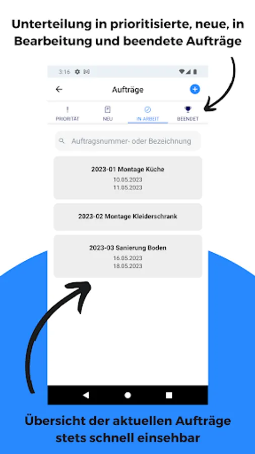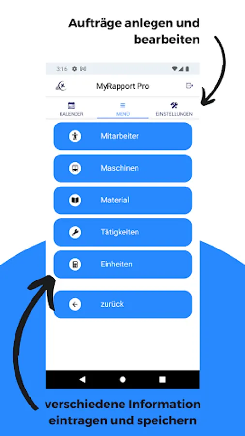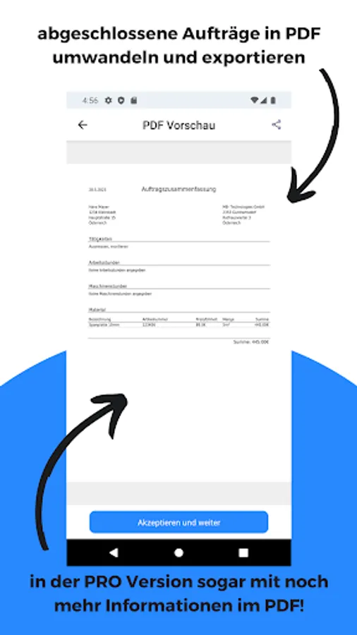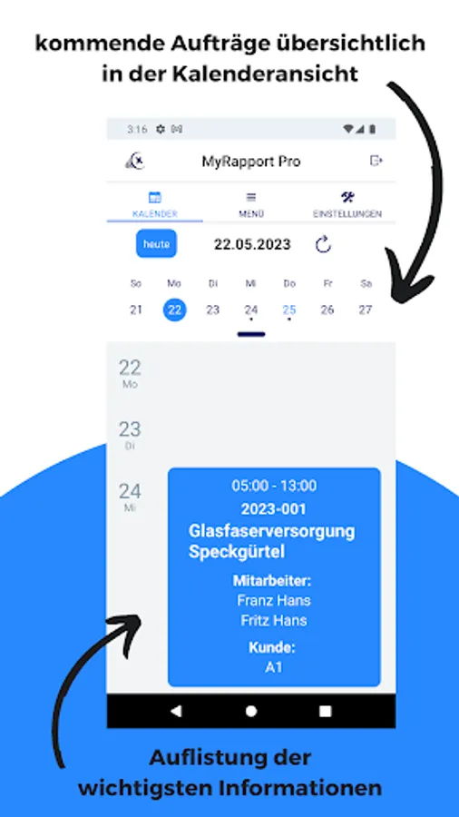 With MyRapport, craft businesses have the opportunity to process their orders digitally and to simplify reporting, filing and invoicing. The app offers the possibility to document an order from start to finish and to finally create a summary PDF document with integrated digital signature. This provides a way to digitally store and forward information such as employee hours and material usage in a uniform manner.