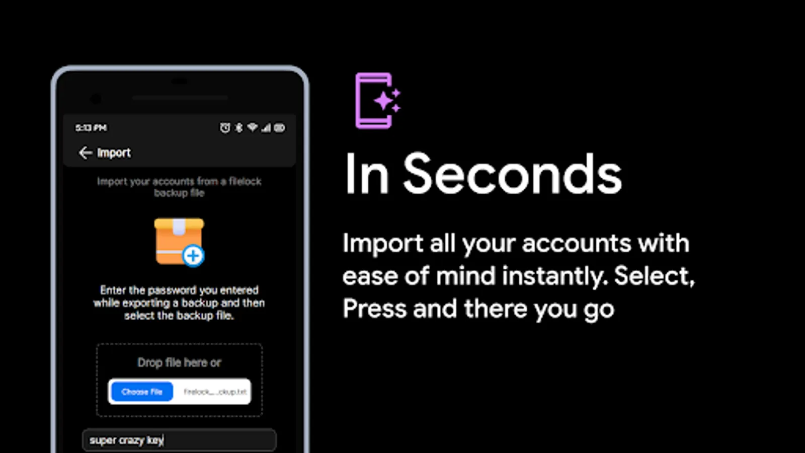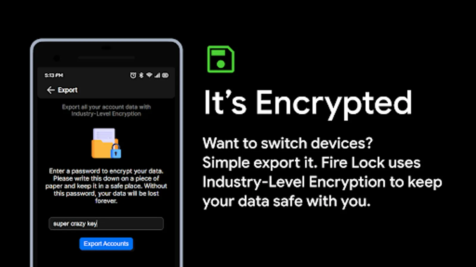 No data is stored on our servers. All data is stored locally on your device. Import and Export your data to keep it safe with your preferred password using AES-256 encryption.