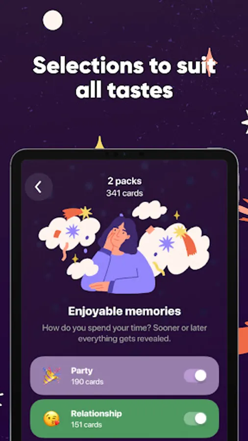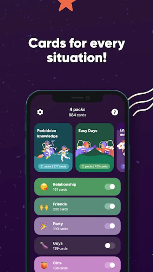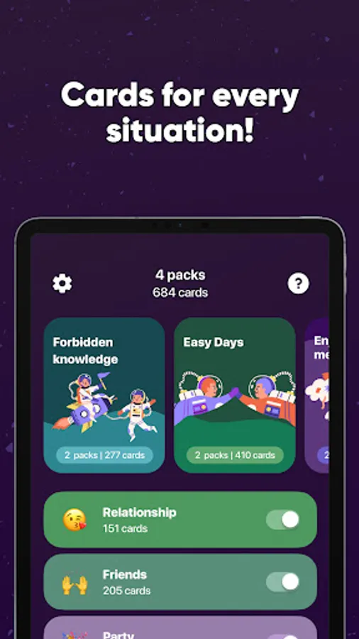 You can choose the sets of questions you want to play, or you can use ready-made packages for all cases