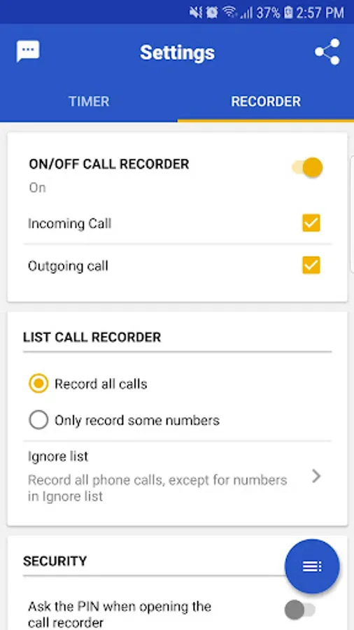 - Manage recording lists according to list items: All, outgoing calls, incoming calls.