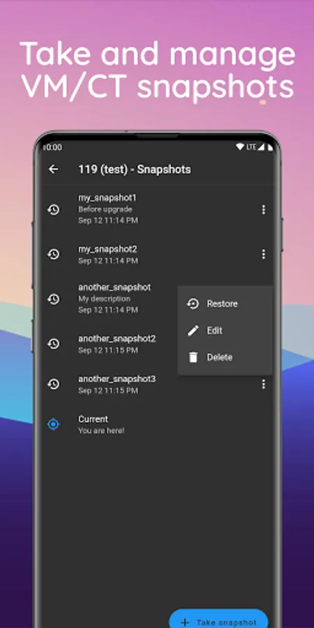 • View, take, edit, delete, and rollback VM and container snapshots.