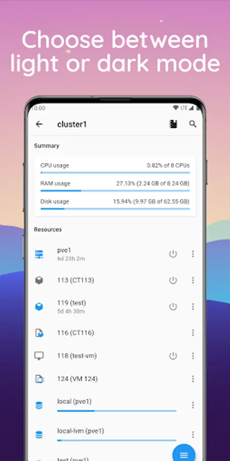 • View Proxmox nodes, storage pools, VMs, and containers' statuses.