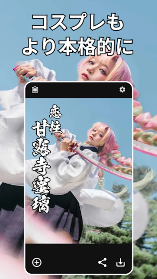 呼吸やキャラクターのカメラフレームや、アニメで使われたフォント「闘龍書体」を使用した文字スタンプなどを使って好きな写真を編集して楽しめます。