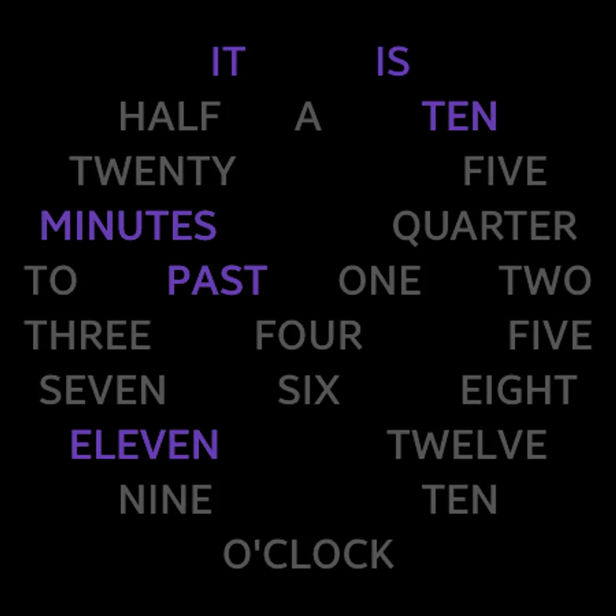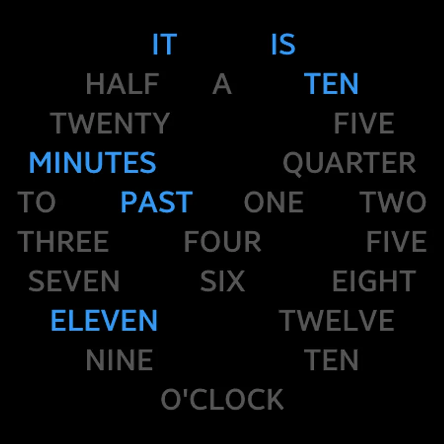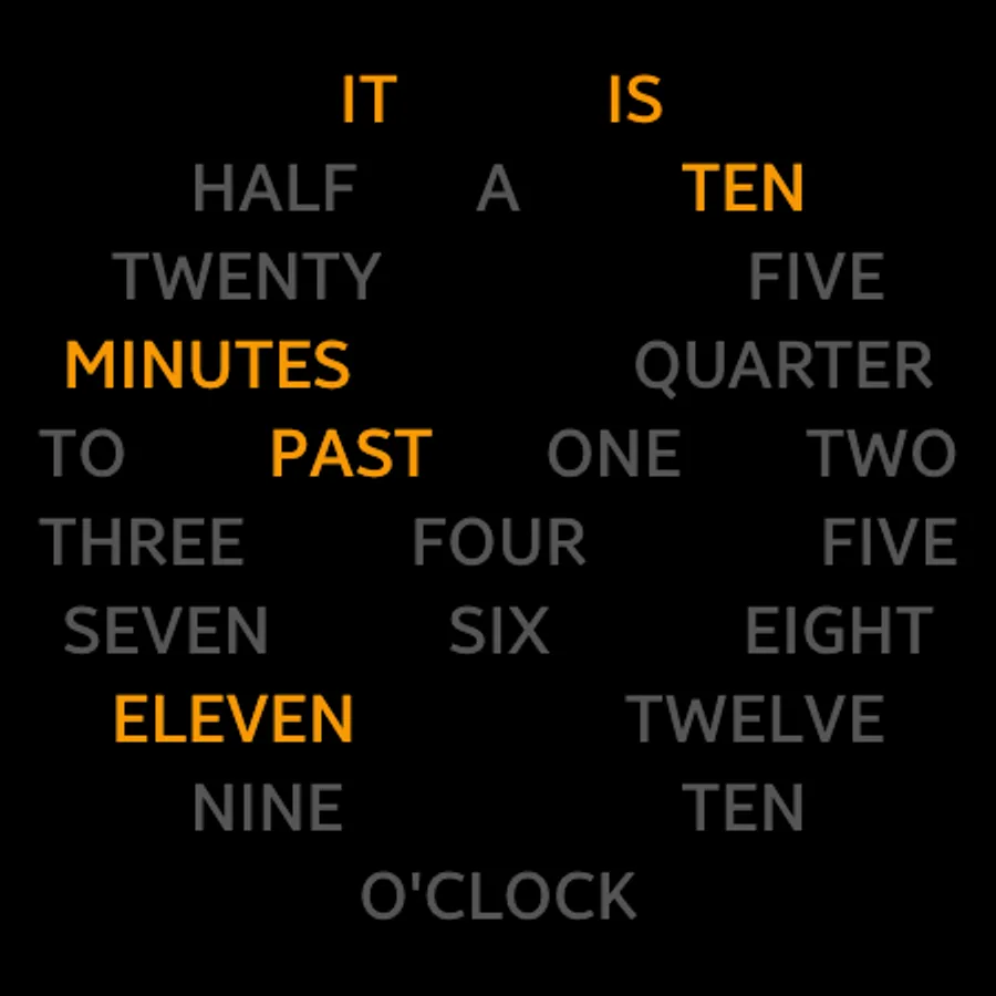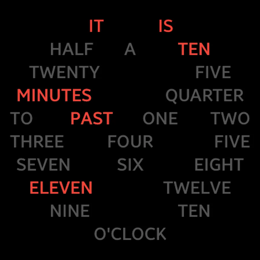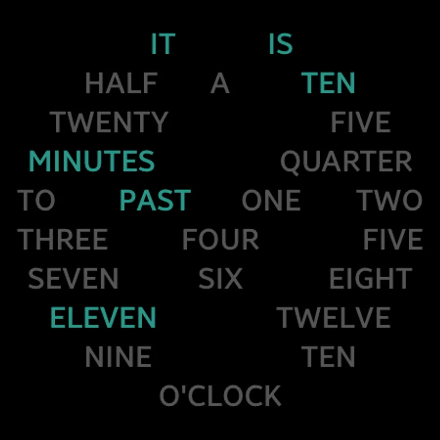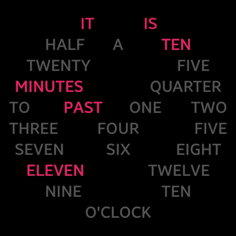 • E.g. 11:10 — IT IS TEN MINUTES PAST ELEVEN