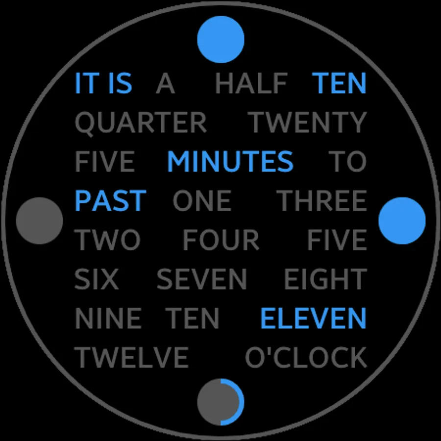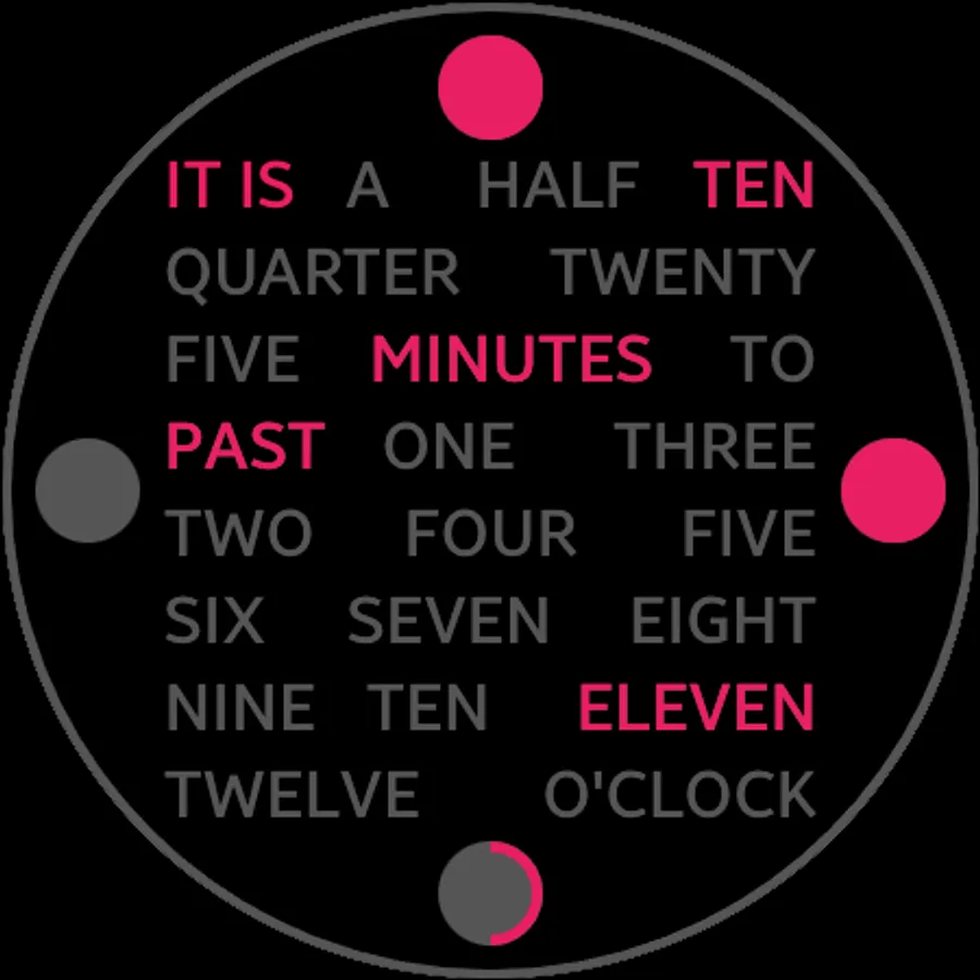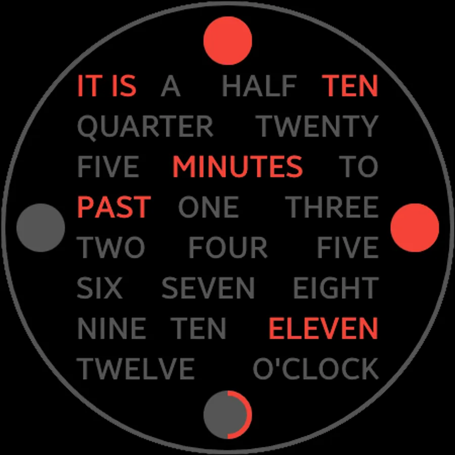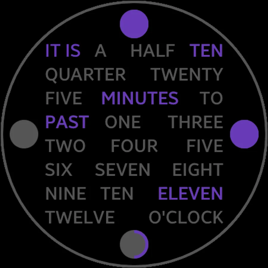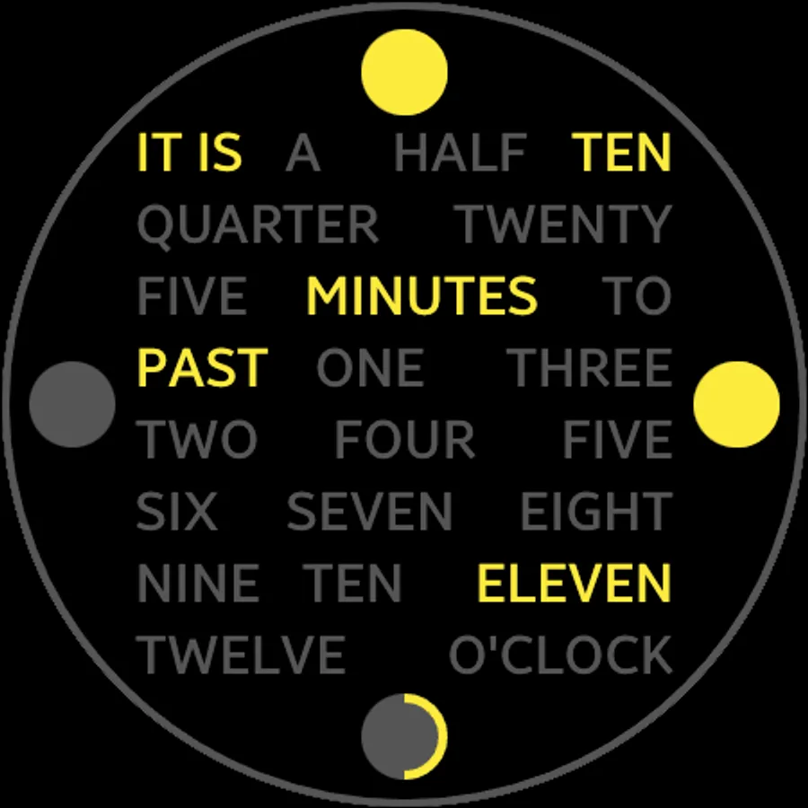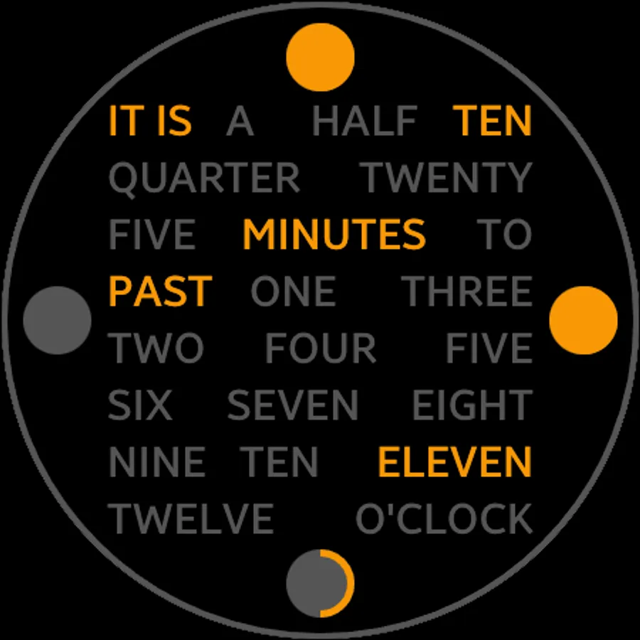 • E.g. 11:12 — IT IS TEN MINUTES PAST ELEVEN (2 filled-in circles)