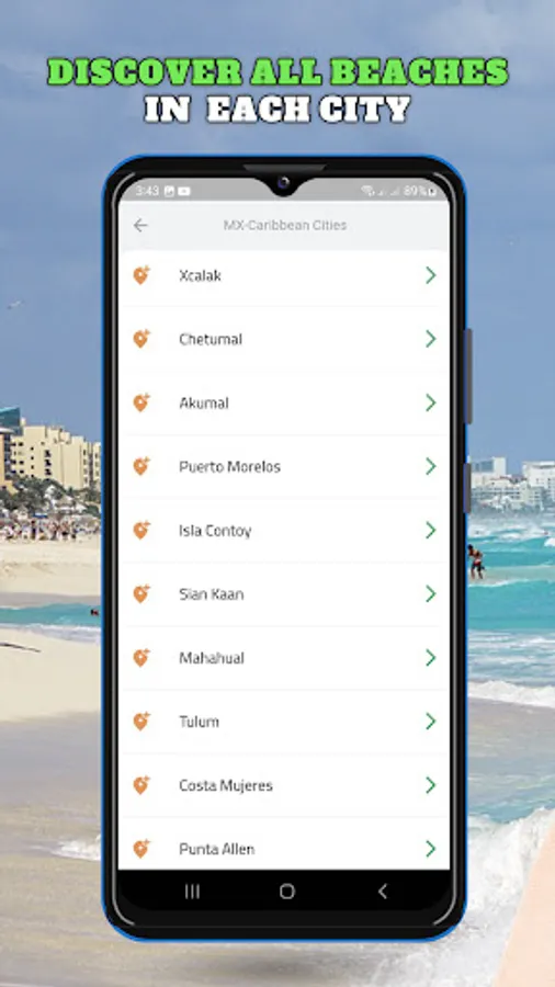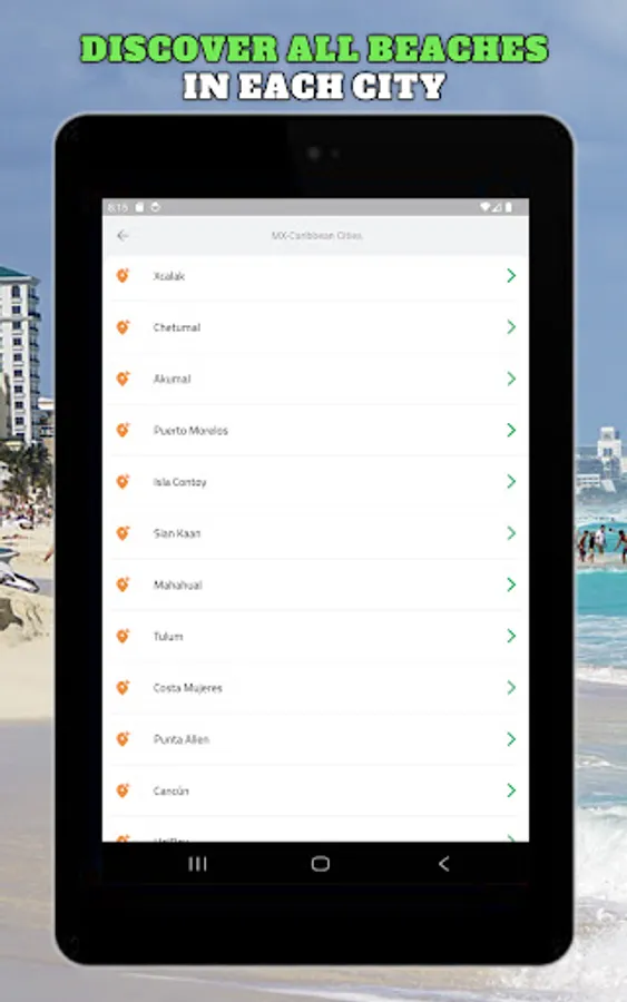 Beaches: Cancún, Playa del Carmen, Tulum, HolBox, Isla Mujeres, Cozumel, Isla Contoy, Costa Mujeres, Riviera Cancún, Puerto Morelos, Riviera Maya, Akumal, Sian Kaan, Punta Allen, Mahahual, Chetumal, Xcalak