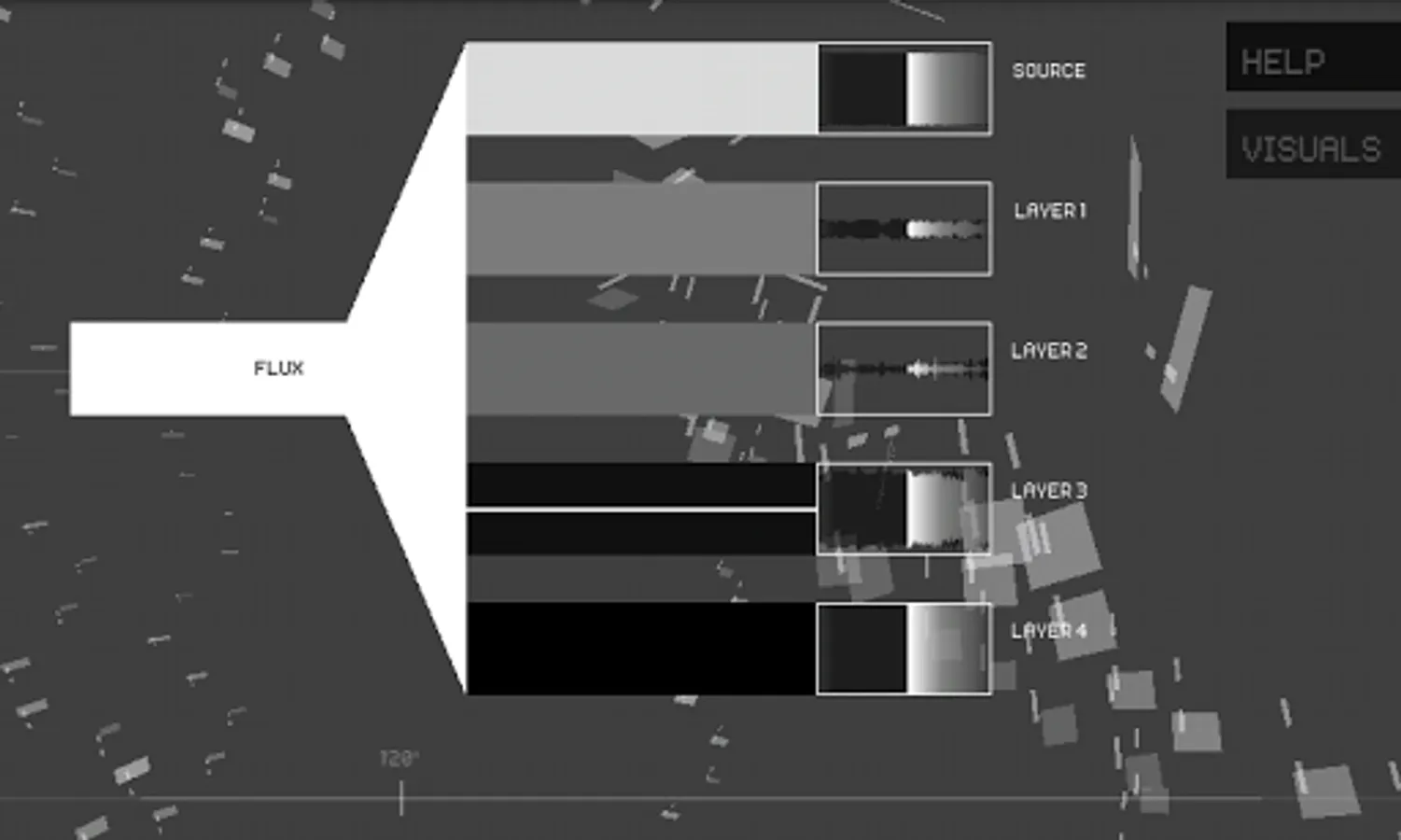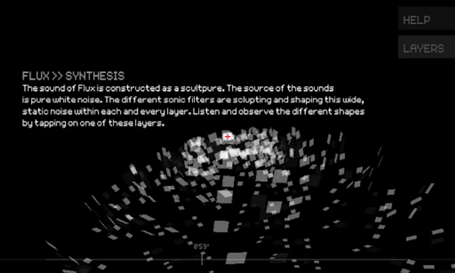 Flux is an ever-changing digital sound sculpture. Draw a simple gesture that will define the overall shape and structure of the evolving composition. The gesture is analyzed by the system, and certain parameters define length, movements and mood of the audiovisual composition. Every element is calculated on the fly, based on your initial gesture and some simple algorithms.