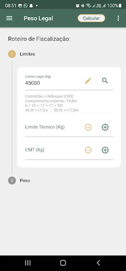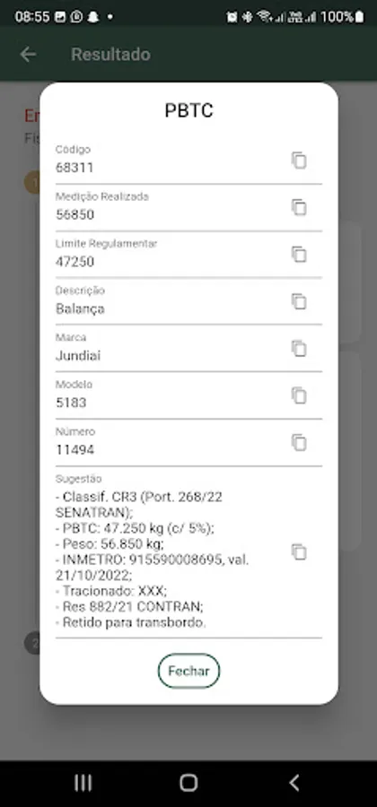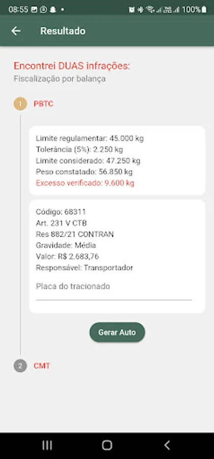 Excesses over PBT, PBTC and CMT are considered, all calculations being automatic, with only the necessary minimum data being entered. The result is displayed in order to facilitate the copy for the effective notice of infraction.