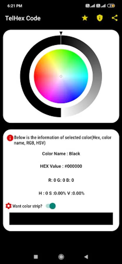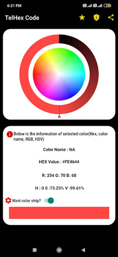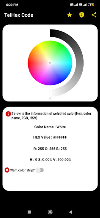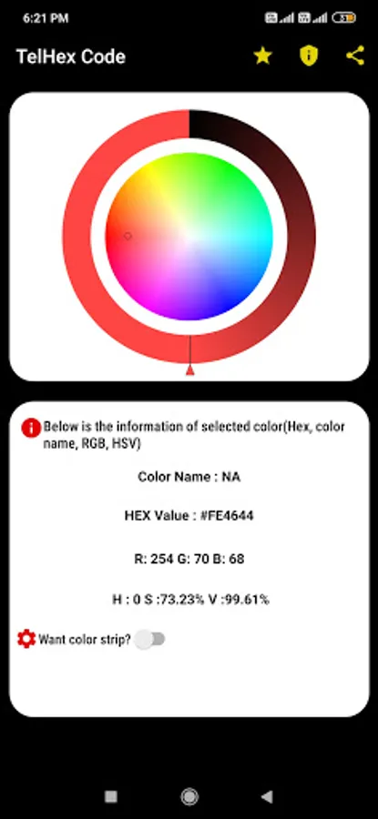 TelHex Code App will tell you Hexadecimal Value, RGB Value and HSV Value of a particular color. TelHex Code not only give Hex value but also give how much red, green,blue color are present in particular color and HSV(Hue Saturation Value) of particular color.
