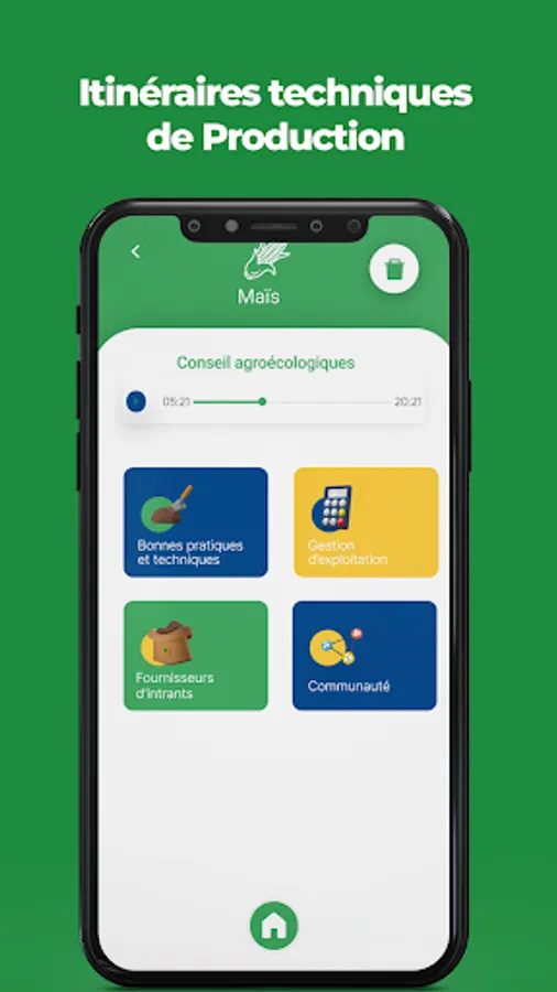 Agricef Maïs is an application for managing the operating account, disseminating information, facilitating access to inputs and agricultural equipment that is easily usable by the vast majority of producers (including those who are illiterate). It can also detect diseases related to maize plants