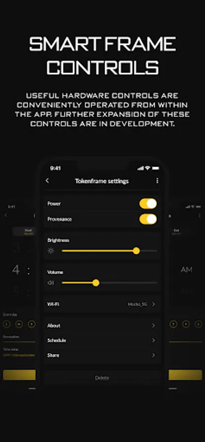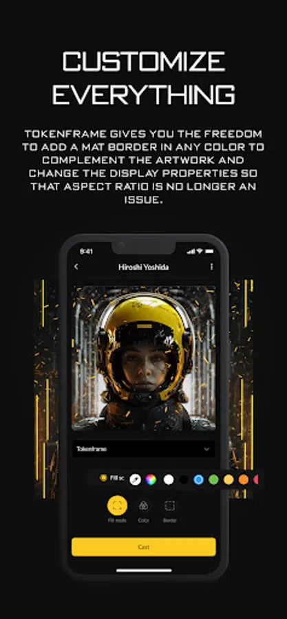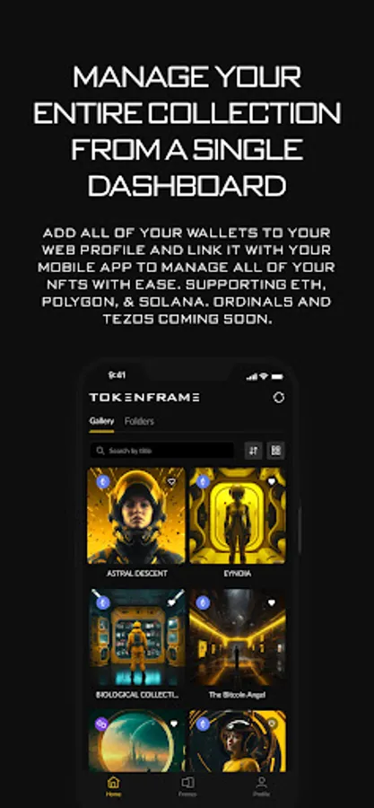 Scan the QR code on your Tokenframe to connect it to WiFi and link it to your mobile app profile. Then, link all of your wallets to a single profile via the web app and link it to your mobile profile. Now you have full access to display any of the NFTs in all of your wallets from your phone with 0% security risk. Wallet delegation, the smart way.